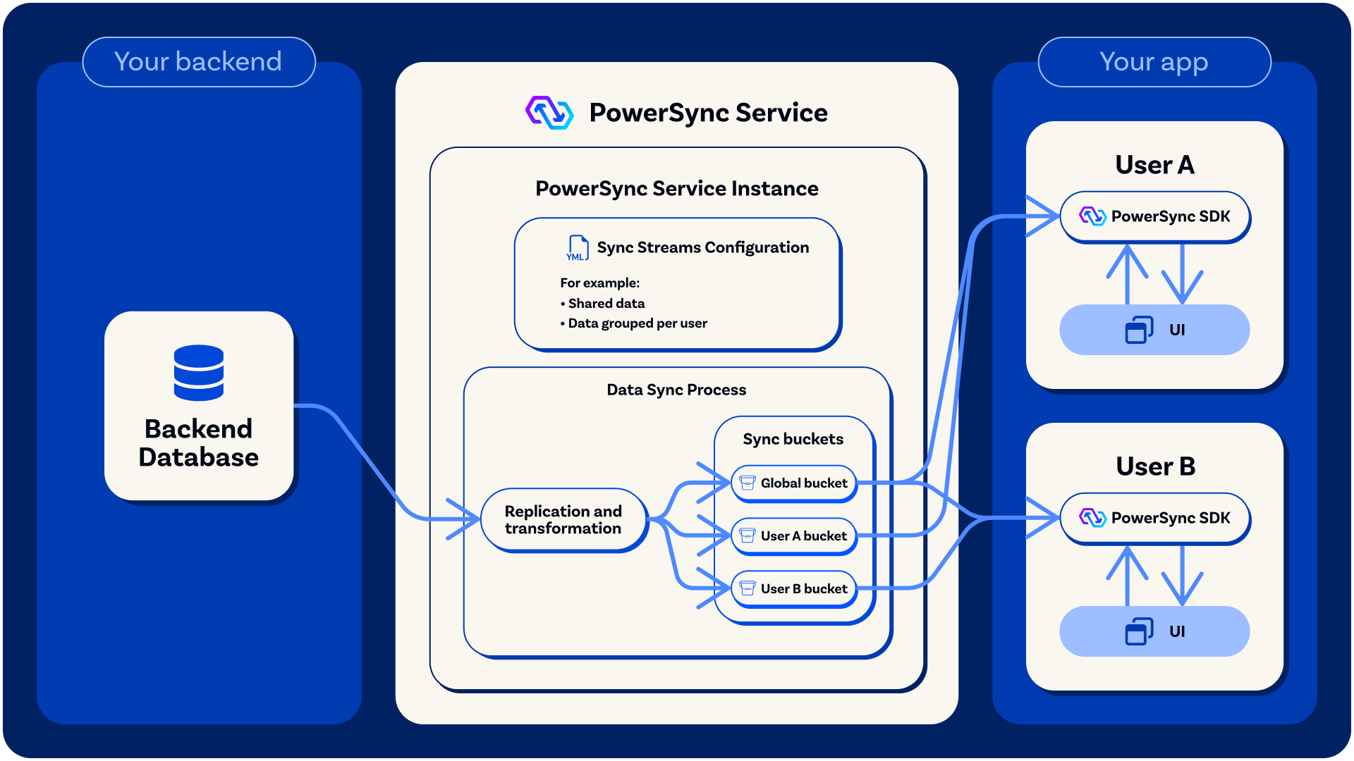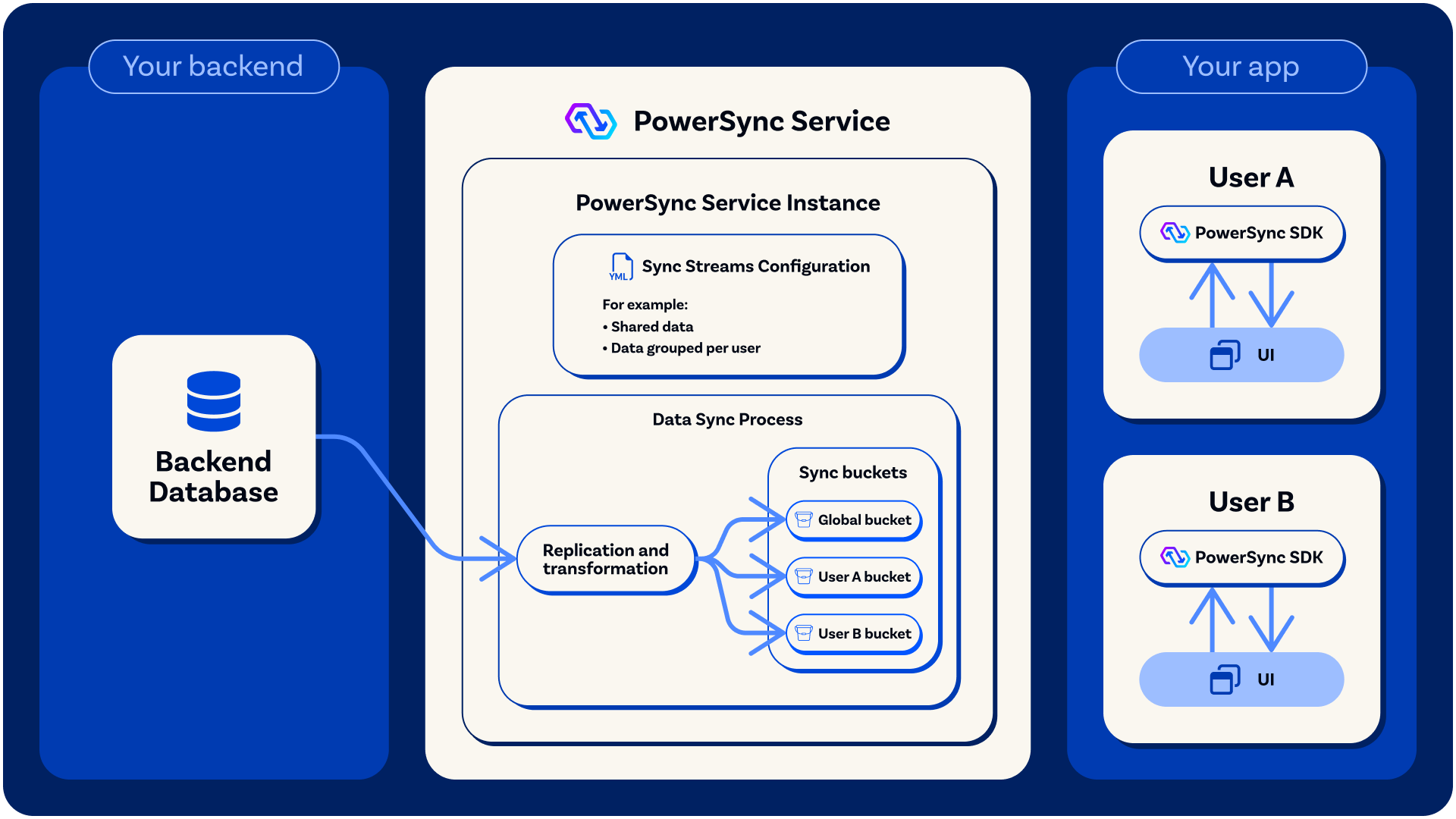 A PowerSync Service instance replicates and transforms relevant data from your backend source database according to your Sync Streams (or legacy Sync Rules). During replication, data and metadata are persisted in buckets on the PowerSync Service. Buckets are incrementally updated so that they contain the latest state as well as a history of changes (operations). This is key to how PowerSync achieves efficient delta syncing — having the operation history for each bucket allows clients to sync only the deltas that they need to get up to date (see Protocol for more details).As a practical example, let’s say you have a bucket named
